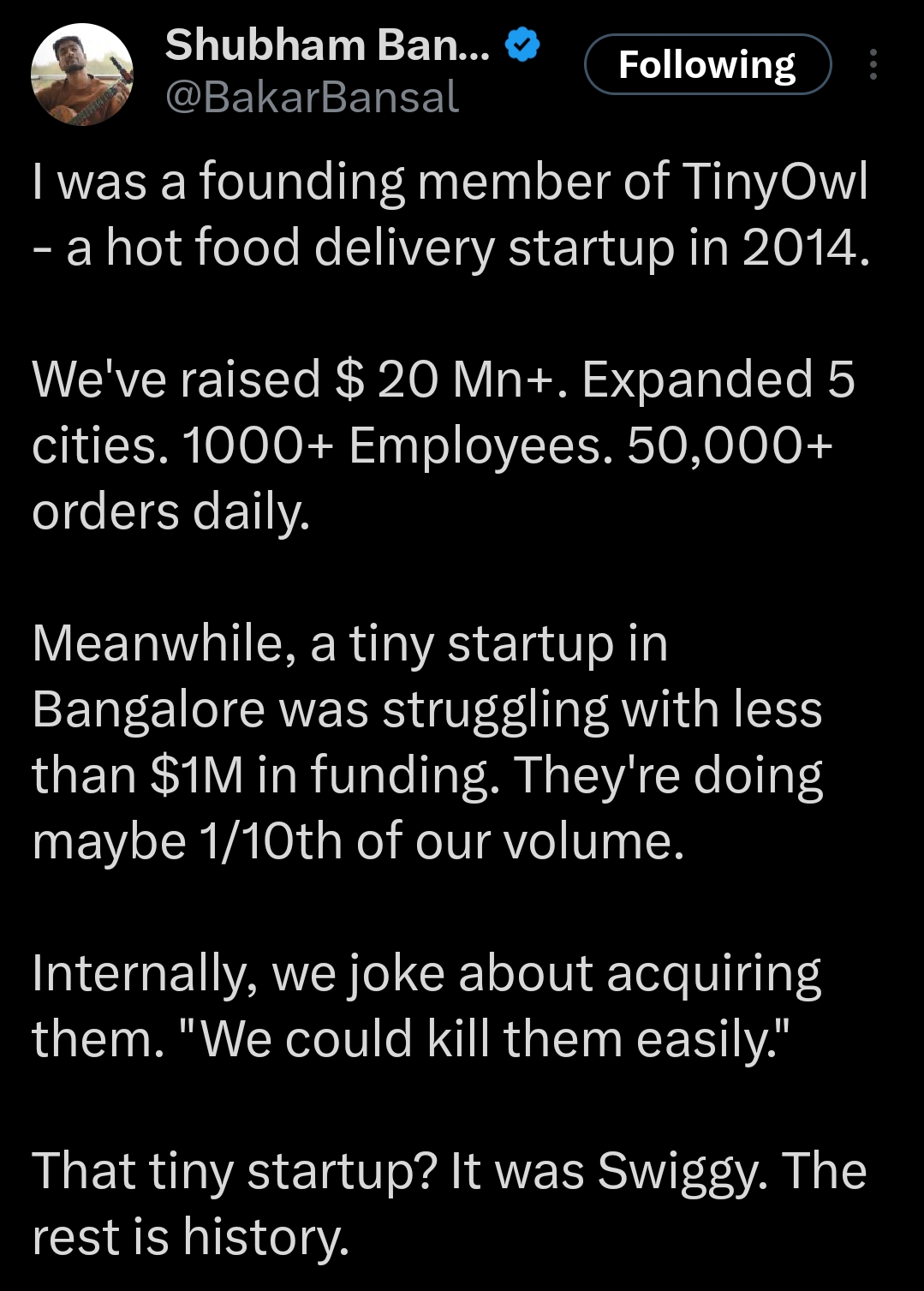 Why Execution Crushed TinyOwl (and Made Swiggy King) 💡 Shubham Bansal, TinyOwl co-founder, just dropped a truth bomb on X: His $20M-funded food delivery giant (50K orders/day in 2014) once mocked an imperfect Swiggy with less than $1M. Result? Sw
