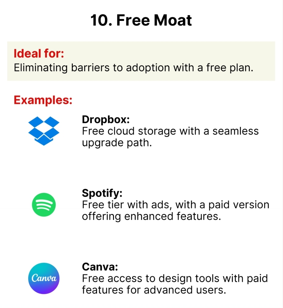Breaking Barriers with the Free Moat! 🚀💡 Companies like Dropbox, Spotify and Canva attract users with free plans, leading to