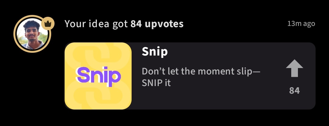 Best notifications! guys do checkout Snip - don't slip a moment let's reach 100 + upvotes 🚀