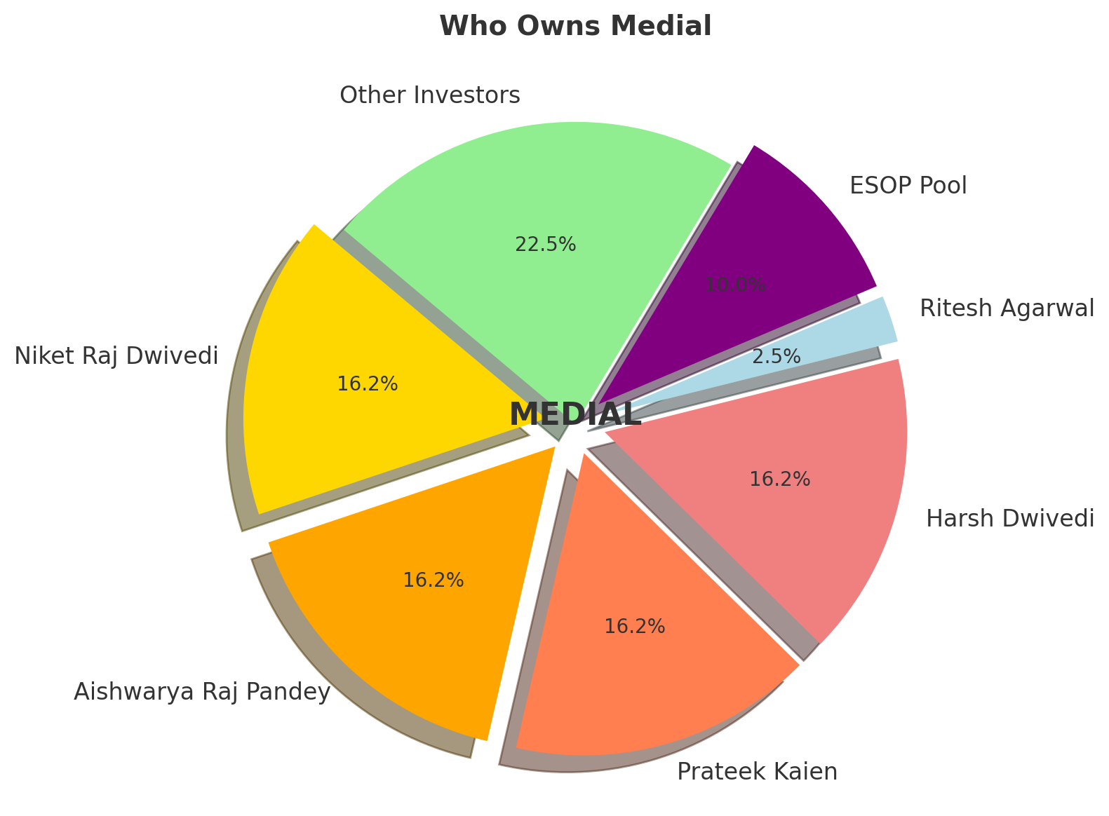 Who owns MEDIAL🚀 (approximate value based on available data) :) Niket Raj Dwivedi: 16.25% Aishwarya Raj Pandey: 16.25% Prateek Kaien: 16.25% Harsh Dwivedi: 16.25% Ritesh Agarwal: 2.5% Other Angle Investors: 22.5% ESOP pool: 10%