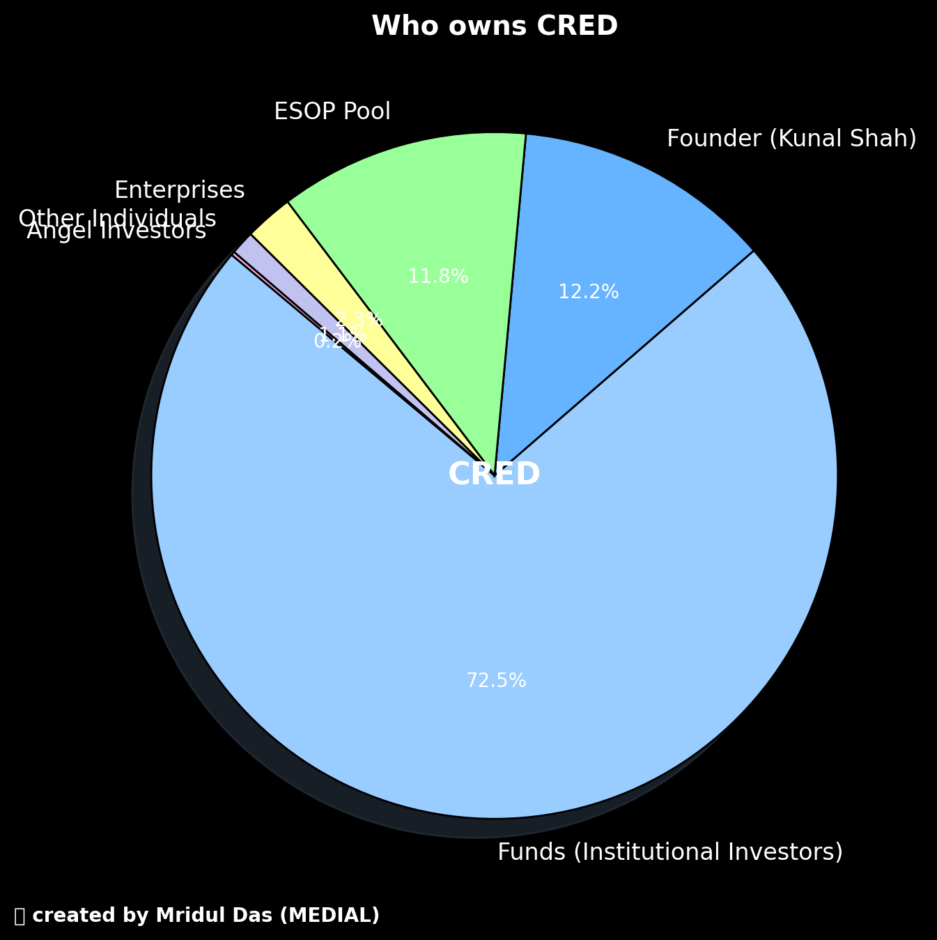 Who owns $6.4 billion CRED. (Based on available data on the internet) Funds (Institutional Investors): Held the majority stake at 72.49%. Founder (Kunal Shah): Owned 12.17% of the company. Employee Stock Ownership Plan (ESOP) Pool: Accounted for 11.77% of the shares. Enterprises: Held 2.28%. Other Individuals: Possessed 1.13%. Angel Investors: Owned 0.17%. Notable institutional investors include Tiger Global Management, Alpha Wave Global, GIC, and Coatue Management.