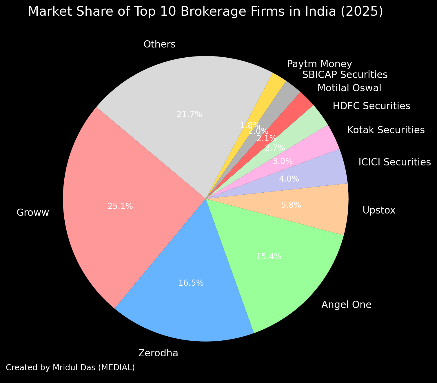 As of 2025 the market share of the top 10 stock brokerage firms in India, based on their active clients. All top 4 are Startups 🚀⭐⭐ 1. Groww Invest Tech Private Limited: Approximately 25.09% market share with 11,461,063 active clients. 2. Zerodha Broking Limited: Holds around 16.50% market share with 8,067,274 active clients. 3. Angel One Limited: Accounts for about 15.40% market share with 7,529,017 active clients. 4. Upstox Securities Private Limited: Maintains a 5.84% market share with 2,852,978 active clients. 5. ICICI Securities Limited: Holds a 3.96% market share with 1,934,288 active clients. 6. Kotak Securities Limited: Possesses a 2.99% market share with 1,462,281 active clients. 7. HDFC Securities Limited: Has a 2.73% market share with 1,335,188 active clients. 8. Motilal Oswal Financial Services Limited: Holds a 2.05% market share with 1,004,570 active clients. 9. SBICAP Securities Limited: Accounts for 2.02% market share with 986,160 active clients. 10. Paytm Money Limited: Maintains a 1.75% market share with 802,146 active clients.