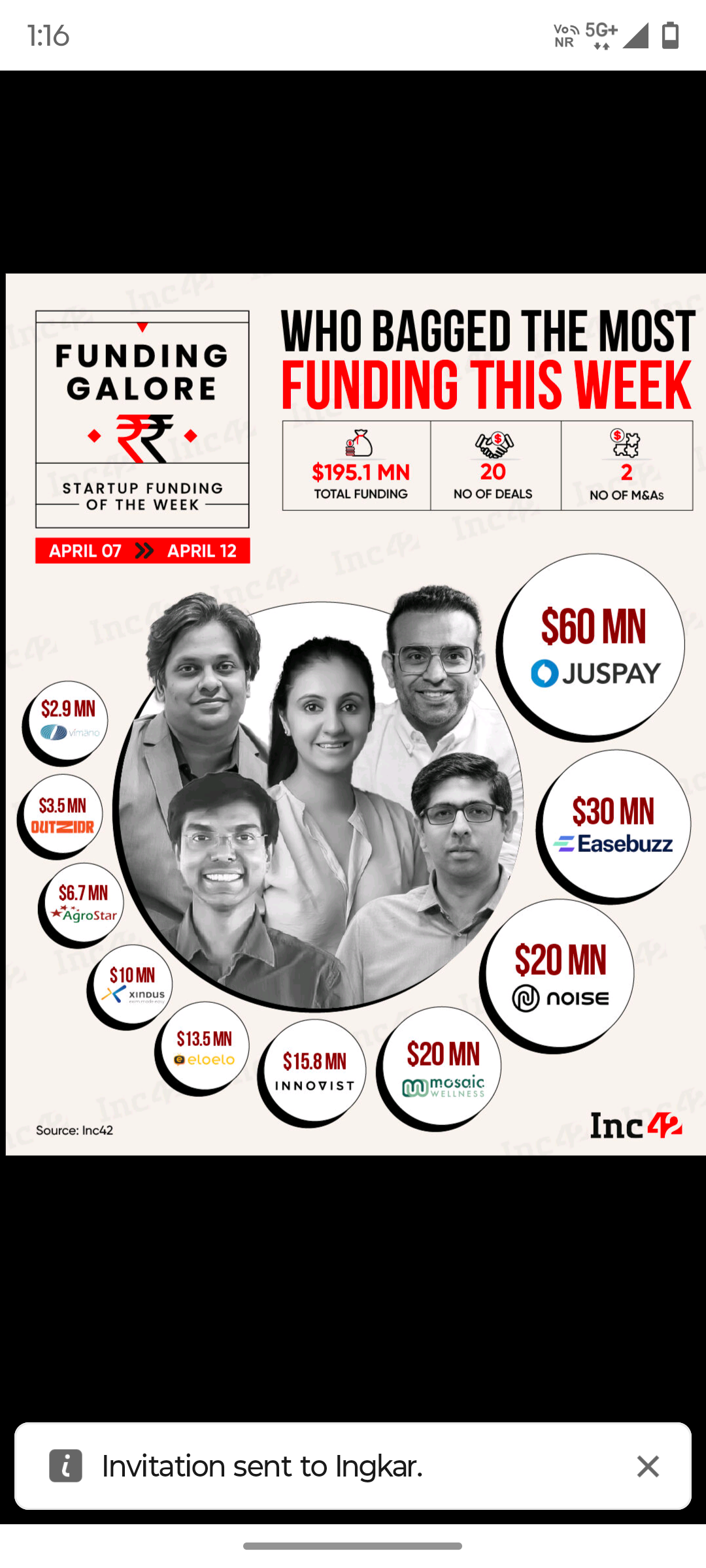 list of startup funding rounds reported for the week of April 7 to April 12, 2025: - Juspay : $60 million - Easebuzz. : $30 million - Noise. : $20 million - Mosaic Wellness. : $21 million - Innovist: $15.8 million - Oleo. : $13.5 million