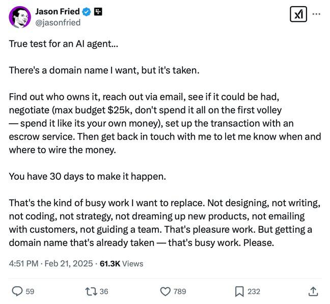 Founders struggle to acquire good .com domains, spending too much time on negotiations. This "busy work" is an ideal AI task. The tech is ready—email scraping, negotiation bots, transaction APIs—yet no simple AI agent exists to act as a "domain con