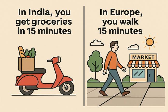 In India, groceries come to your door in 15 minutes. In Europe, you walk 15 minutes — on a clean sidewalk, breathing fresh air, no noise or chaos — and reach the store. Which one feels like real progress? Fast delivery isn’t always a win when it c