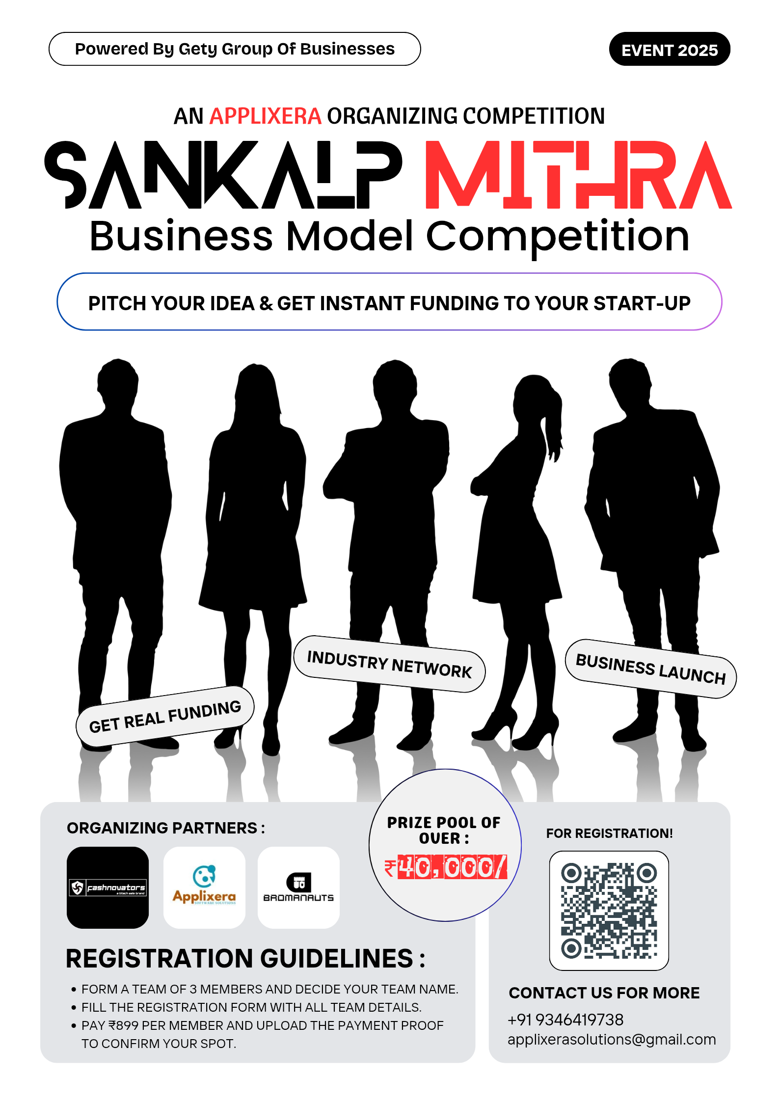 🎯 Applixera Sankalp Mithra Business Pitch Challenge 2025 🎯 Are you a student with a bold idea that can change the world? Here’s your chance to turn it into reality! 🚀 ✨ How it works: 💰 Registration Fee: ₹899 per participant 👥 Teams of 3 memb