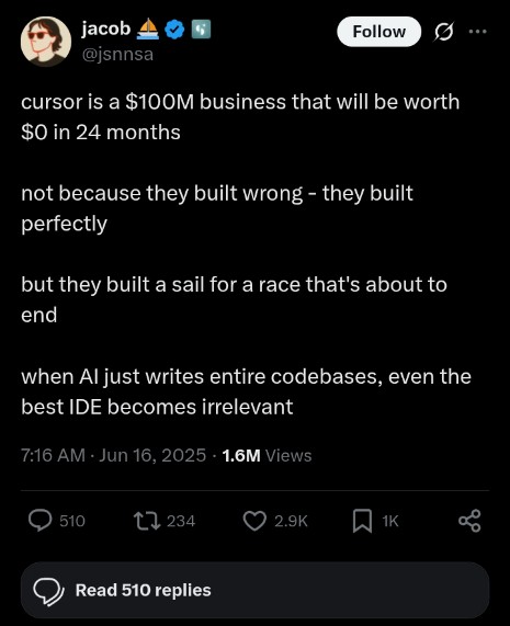 Cursor is a great tool that makes coding easier, and it was built really well. But sometimes, even the best tools lose value when the world changes fast AI is starting to write full codebases on its own. If that becomes normal, tools like Cursor (wh