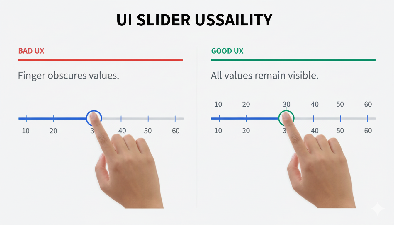 In mobile UI, put the slider values above the slider, not below. Because when users touch it, their index finger covers part of the values, so they won't be sure which value is currently Selected in mobile UI, put the slider values above the slider,