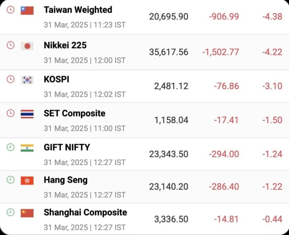 Asian Markets see pressure after a HUGE SEll OFF in American Markets on Friday. Gift Nifty too down by 1.24%