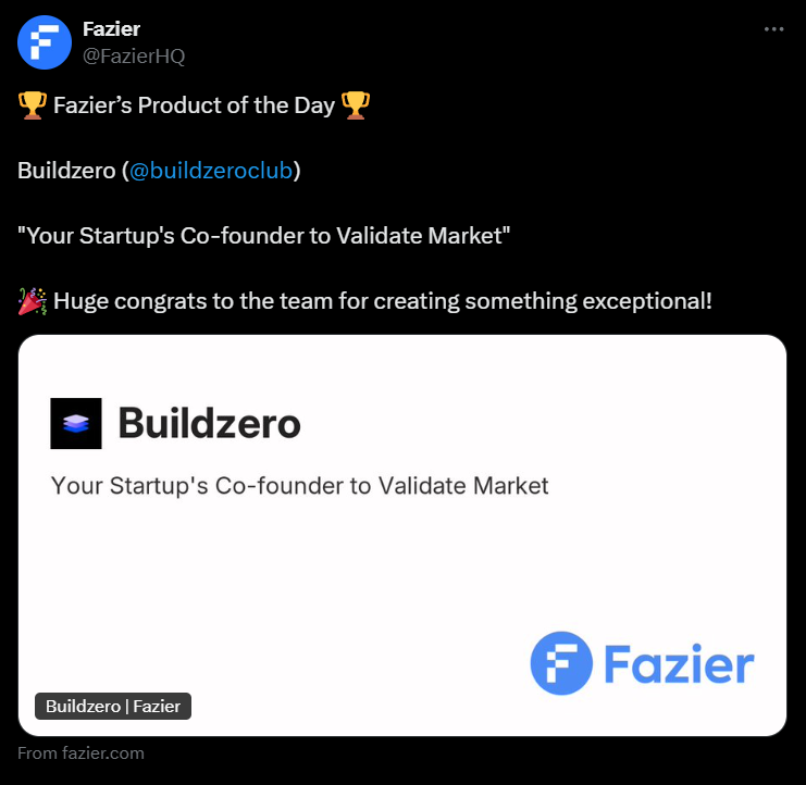 🔥 Big News! 🔥 We're thrilled to announce that Buildzero has been named Fazier's Product of the Day! 🏆🚀 "Your Startup's Co-founder to Validate Market" – we’re on a mission to help founders validate their ideas faster and smarter. A huge thank you to our team and supporters for making this possible! 🙌 Check it out here: https://fazier.com/launches/buildzero