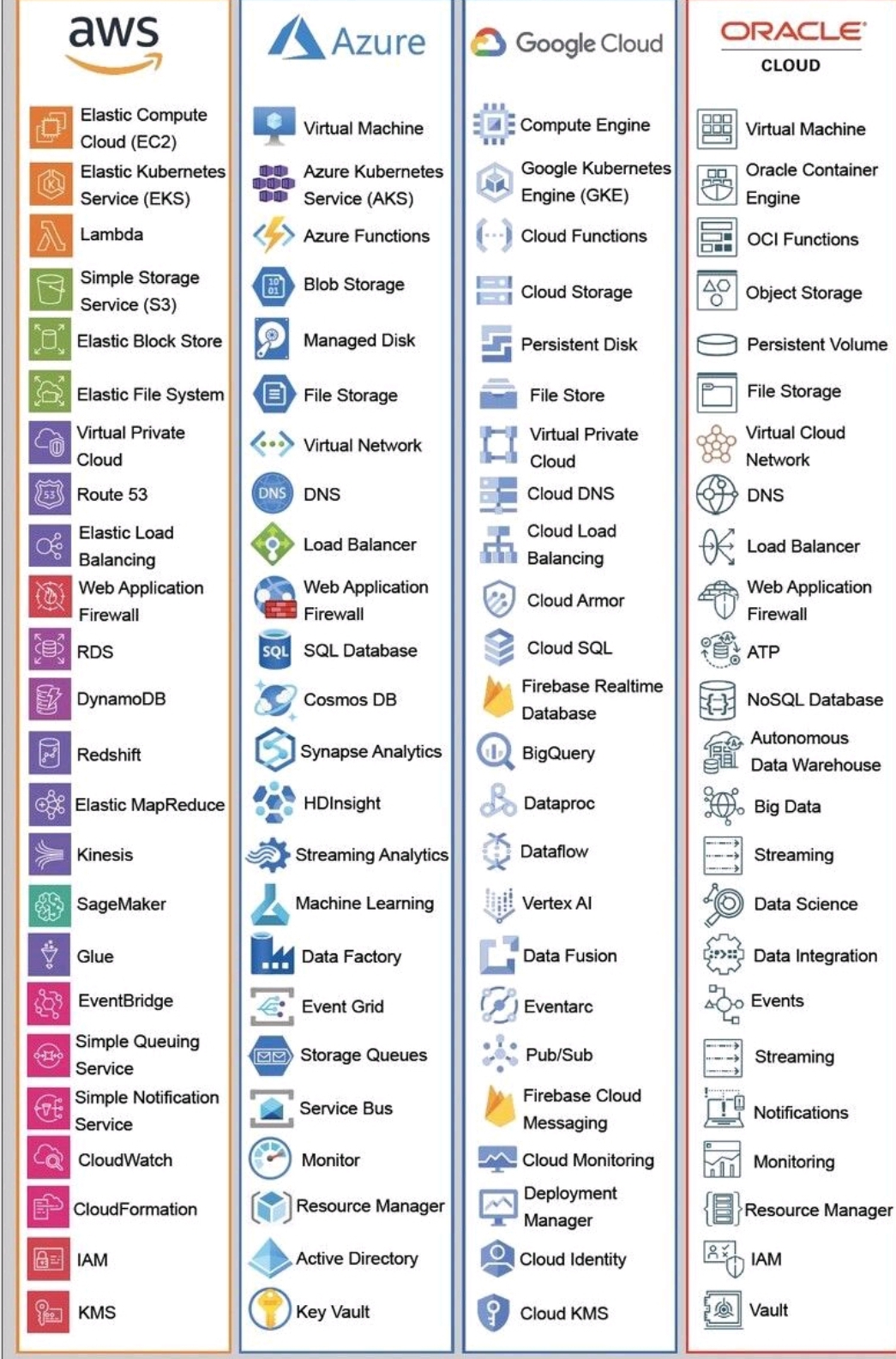 ☁️ Cloud Services Comparison: AWS vs. Azure vs. Google Cloud vs. Oracle Cloud! 🚀📊 Choosing the right cloud provider? Here’s a side-by-side breakdown of key services from AWS, Azure, Google Cloud and Oracle Cloud! 🏆💡