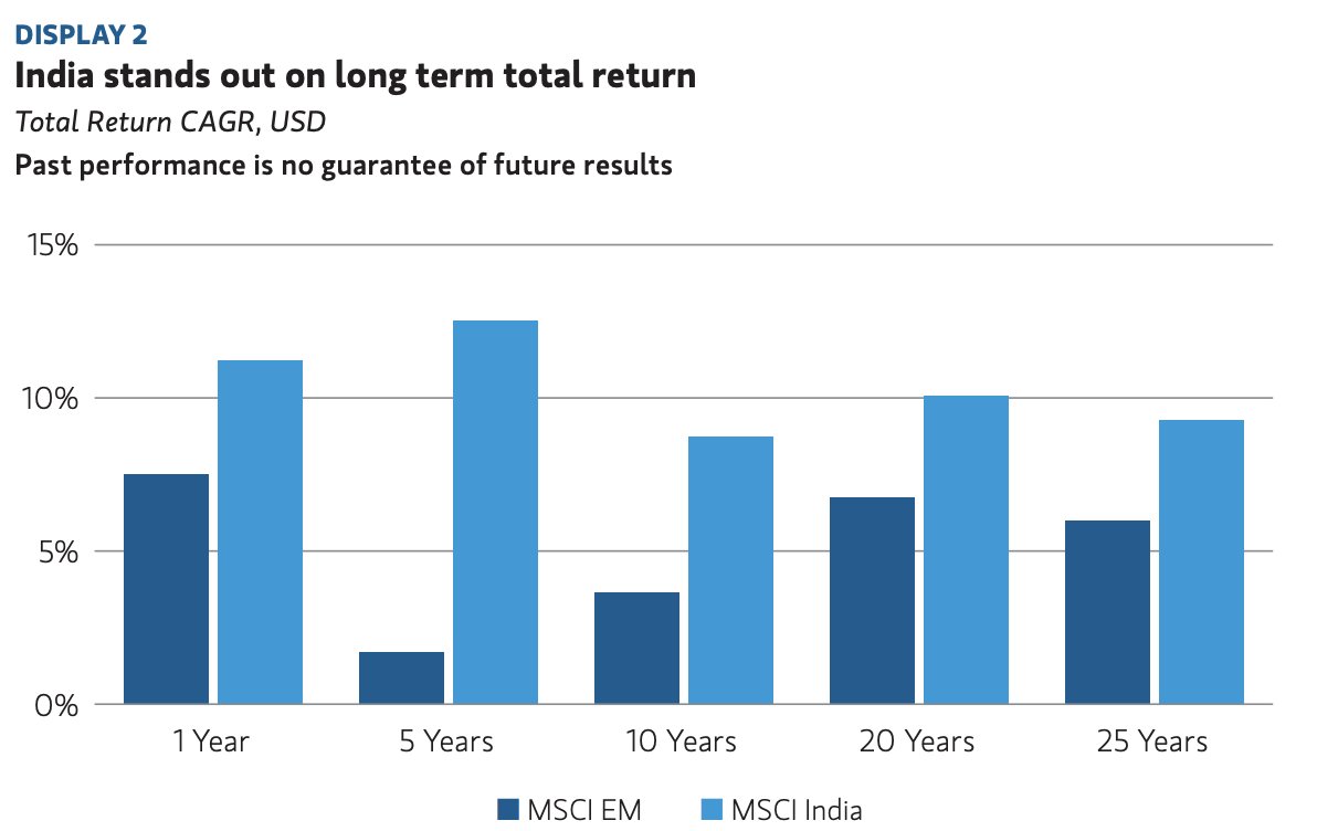 - Contributes 3.5% of global GDP but makes up only 1.9% of MSCI ACWI index (tracks large and mid-cap stocks across 23 developed and 24 emerging markets) โ Notably, ~10% of the world's high-quality companies are from India (15%+ ROIC & revenue CAGR)