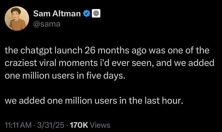 Sam shared that ChatGPT gained a million users in the last hour. Proof that the average consumer isn’t chasing AGI; they just want to create fun, engaging graphics. Looks like AI finally found a solid mainstream use case.