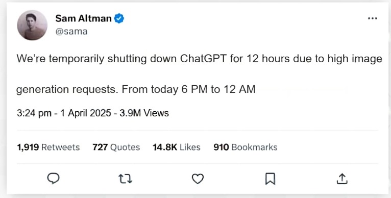 Sam Altman is shutting down chatgpt for 12 hours due to high image generation request ๐ฒ๐ฒ