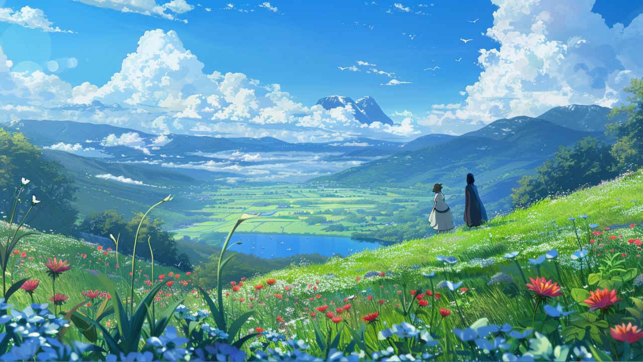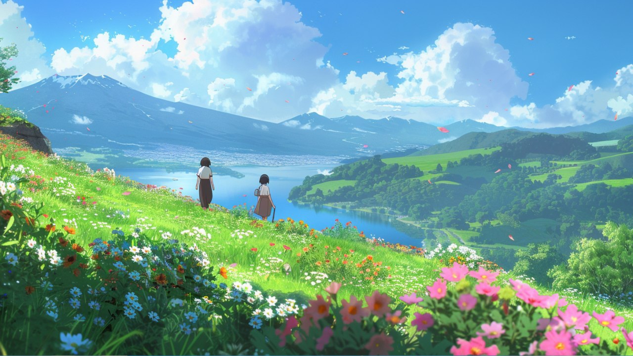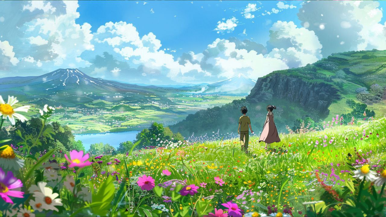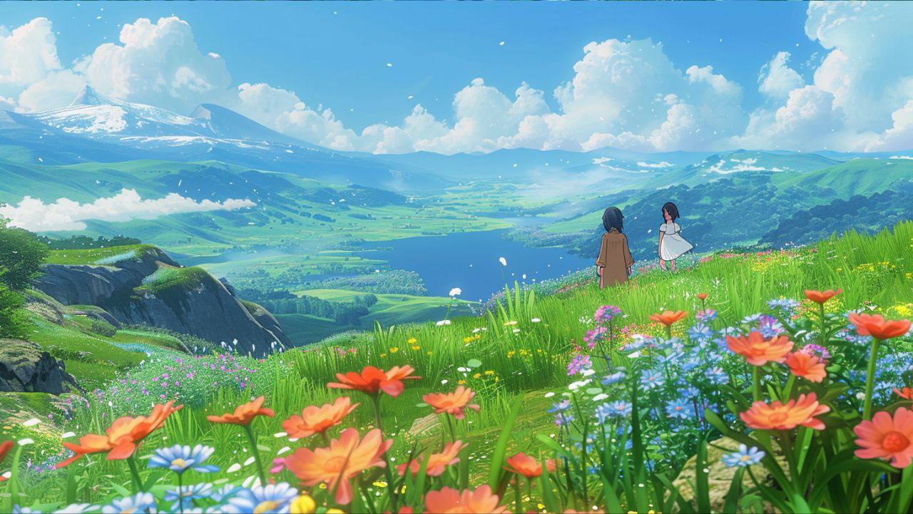 ๐จ Seriously that's the fucking amazing , just like Anime Prompt ๐ฅ A serene, picturesque landscape with vibrant flowers in the foreground and rolling green hills. Two characters are walking on the hillside under a vast, blue sky with large, flu