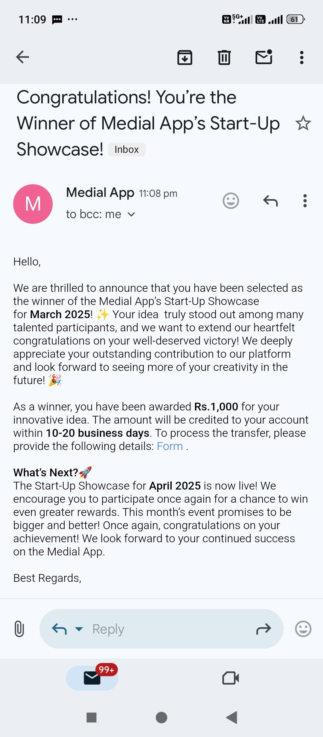 "A small step towards achieving my dream! Grateful to be the winner of Medial App's Start-Up Showcase for March 2025!"