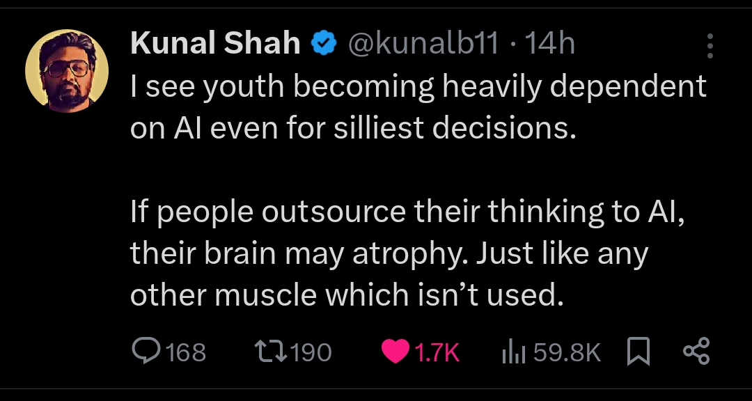 Kunal Shah's opinion on AI for youth. As we evolve will the brain just fade away like our tail?
