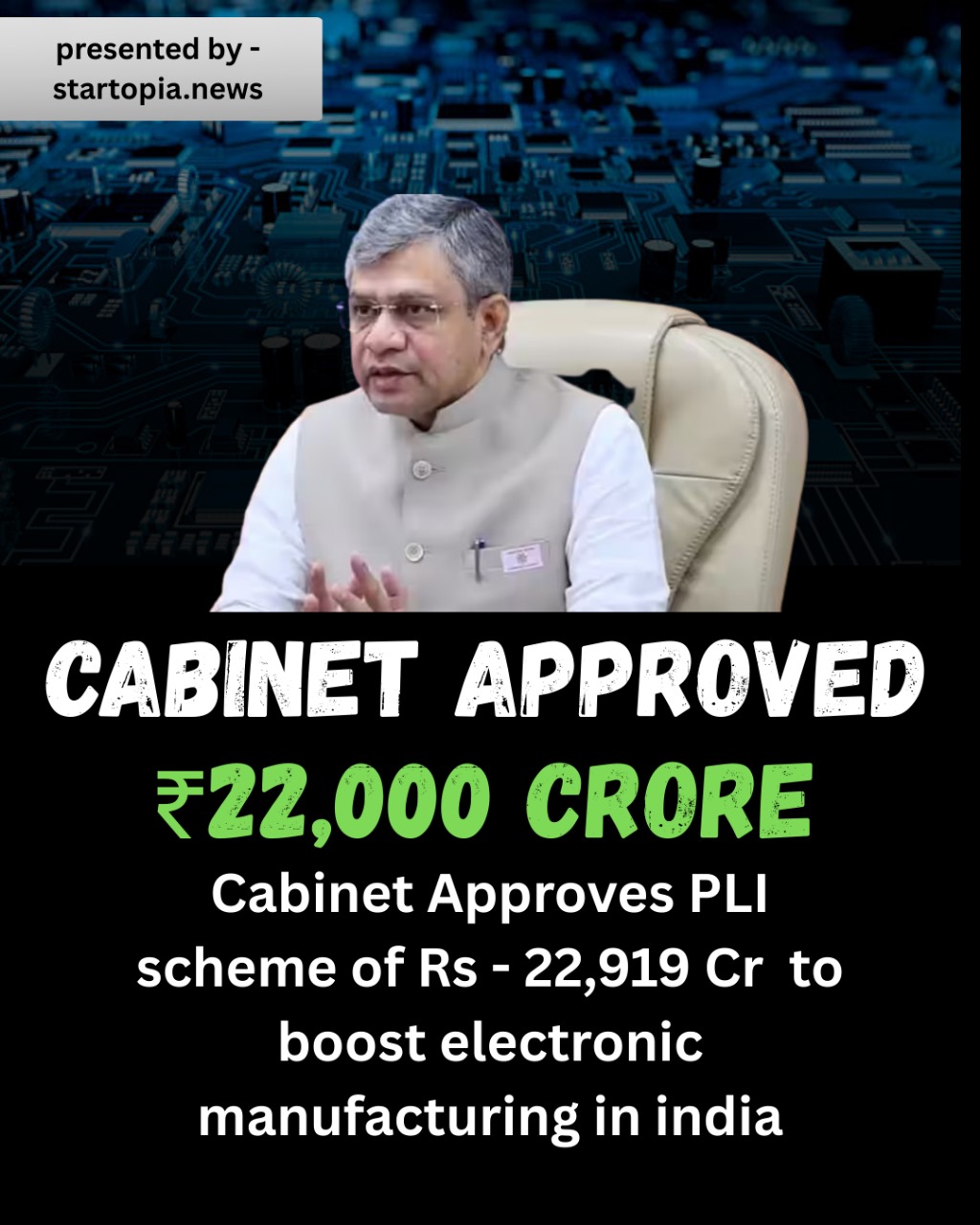 The Indian Cabinet has approved a PLI scheme worth ₹22,919 Cr to accelerate the growth of electronic manufacturing in India. This initiative aims to strengthen the industry, create jobs, and boost India’s position in the global supply chain.