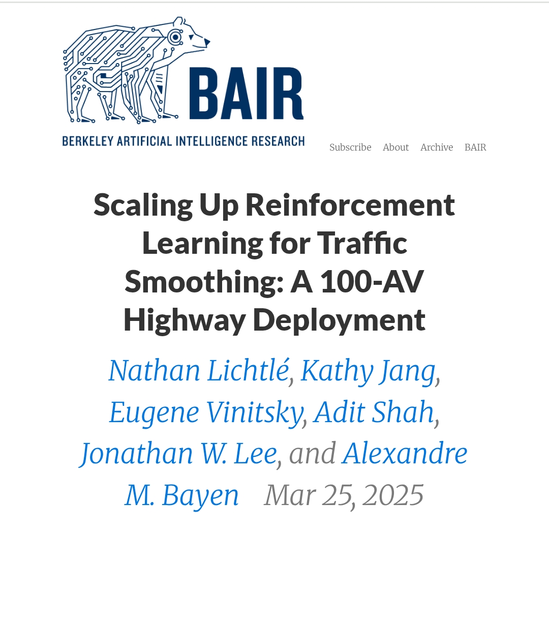 Scaling Up Reinforcement Learning for Traffic Smoothing: A 100-AV Highway Deployment link: https://bair.berkeley.edu/blog/2025/03/25/rl-av-smoothing/