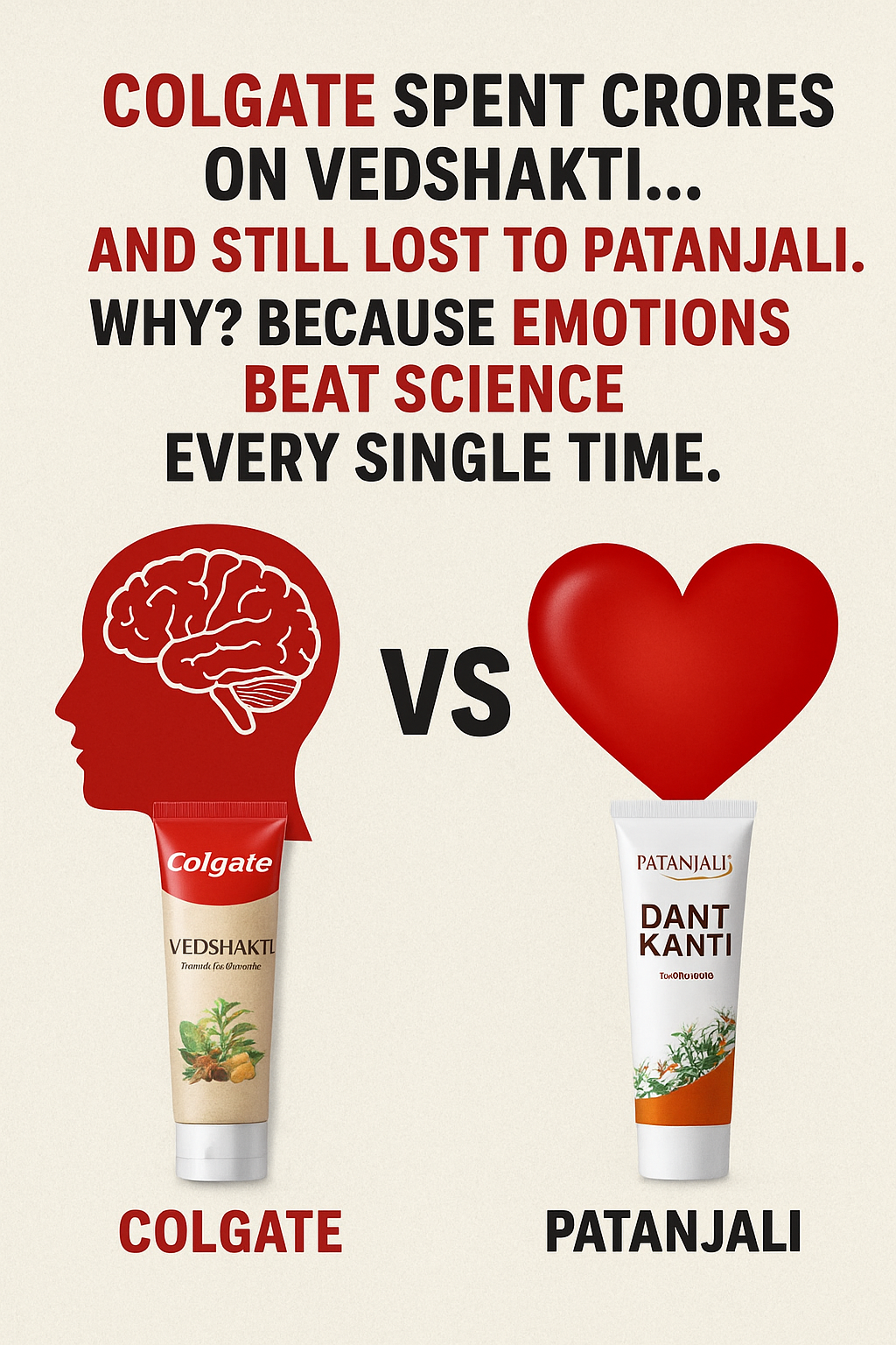 “Colgate spent crores on Vedshakti… and still lost to Patanjali. Why? Because emotions beat science every single time.” 🧠 People buy with emotion first, justify with logic later. But most Ayurveda brands flip it — shouting ingredients & lab tests,