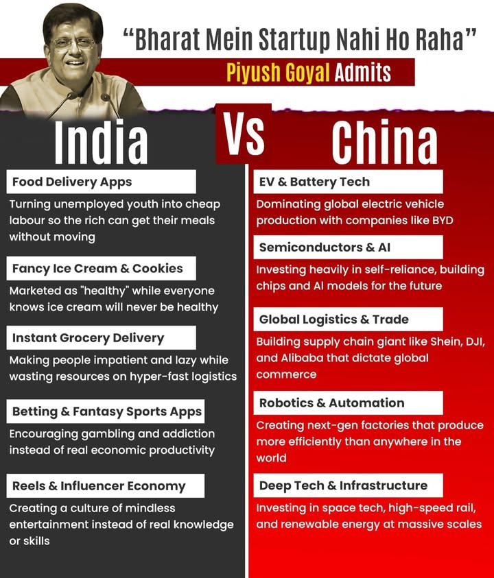 At Startup Mahakumbh, Piyush Goyal ji shared the viral "India vs China: Startup Reality" image, which truly makes one reflect. But the real reality is that India already has powerful startups in sectors like EVs, semiconductors, robotics, and AI—we j