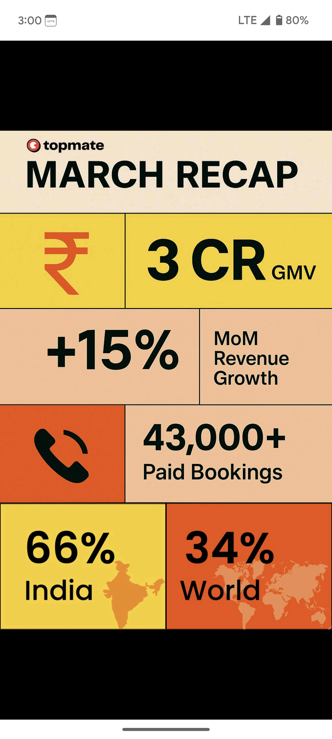 Topmate closed the month with a GMV of approximately ₹3 crore and 43,000 paid bookings. but what's GMV ? GMV" typically stands for Gross Merchandise Value (or Gross Merchandise Volume), and it's a metric commonly used in e-commerce and retail. It refers to the total value of goods sold through a marketplace over a certain period of time. Example: If an online platform sells: 100 shoes at $50 each 200 shirts at $20 each Then the GMV = (100 × $50) + (200 × $20) = $5,000 + $4,000 = $9,000 Important Notes: GMV does not include deductions like discounts, returns, or cancellations. It’s a top-line metric, meaning it shows the total sales before subtracting costs or fees. High GMV doesn't always mean high profits—it just means high sales volume. Follow vishakha Jangir for more such business insights.