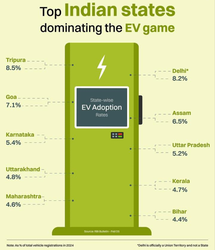 EVs are catching on in India! In 2024, they made up over 7% of all vehicle registrations, up from less than 2% in 2021. And these regions are leading the charge – Tripura, Delhi, and Goa.