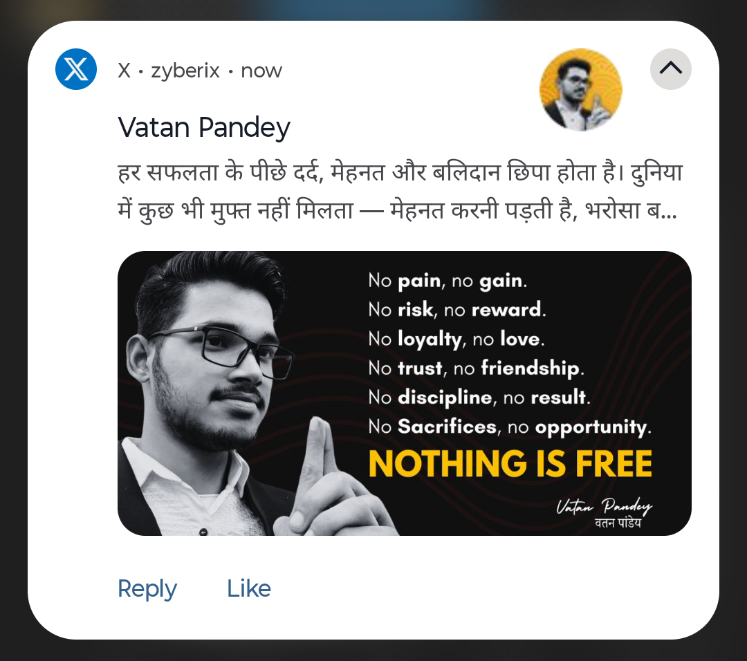 рд╣рд░ рд╕рдлрд▓рддрд╛ рдХреЗ рдкреАрдЫреЗ рджрд░реНрдж, рдореЗрд╣рдирдд рдФрд░ рдмрд▓рд┐рджрд╛рди рдЫрд┐рдкрд╛ рд╣реЛрддрд╛ рд╣реИ ! рджреБрдирд┐рдпрд╛ рдореЗрдВ рдХреБрдЫ рднреА рдореБрдлреНрдд рдирд╣реАрдВ рдорд┐рд▓рддрд╛ тАФ рдореЗрд╣рдирдд рдХрд░рдиреА рдкрдбрд╝рддреА рд╣реИ, рднрд░реЛрд╕рд╛ рдмрдирд╛рдирд╛ рдкрдбрд╝рддрд╛ рд╣реИ, рдФрд░ рд╕рдордп рджреЗрдирд╛ рдкрдбрд╝рддрд╛ рд╣реИред ЁЯФе Because NOTHING is truly FREE. тАФ Vatan Pandey | Founder & CEO, Zyberix