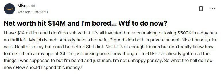 🥹 An Amazon employee complained that his net worth reached $14 million, and he lost interest in life 🙂 A beautiful wife, two kids in private school, houses, cars — the guy literally has everything. But the desire to live and grow is gone — everyth