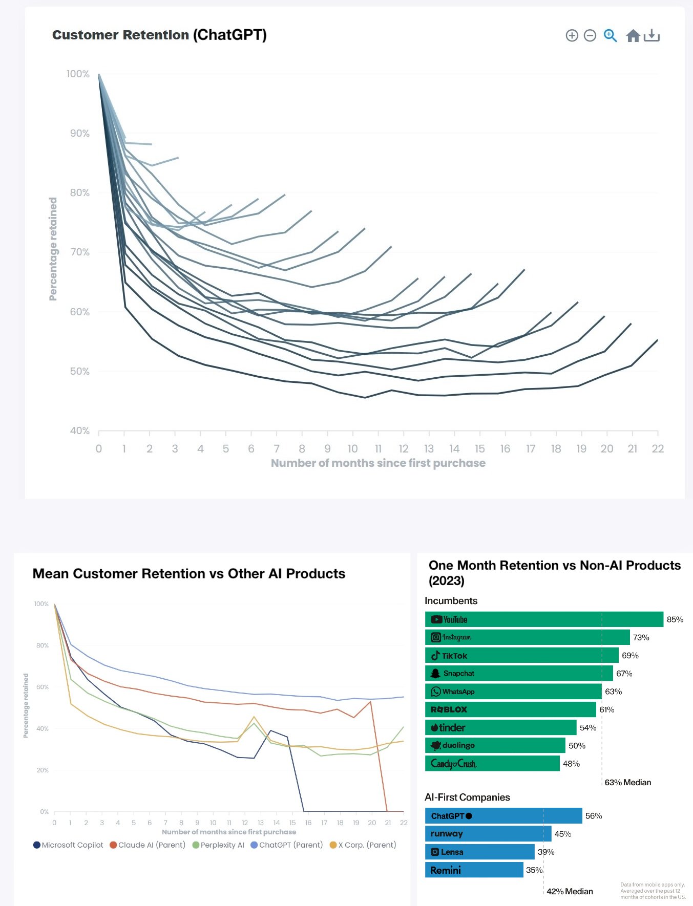 ChatGPT's product retention curves is a product manager's wet dream. Their 1 month retention has skyrocketed from <60% 2yrs ago to an unprecedented ~90%! Youtube was best-in-class with ~85%. 6mo retention is trending to ~80%. Rapidly rising smile c