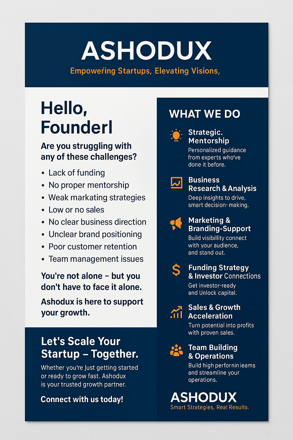 Struggling to build your product or attract your first customers? Youāre not alone ā and you donāt have to do it alone. At Ashodux, we help early-stage entrepreneurs and startups turn ideas into real, scalable businesses. Whether you're stuck on bui