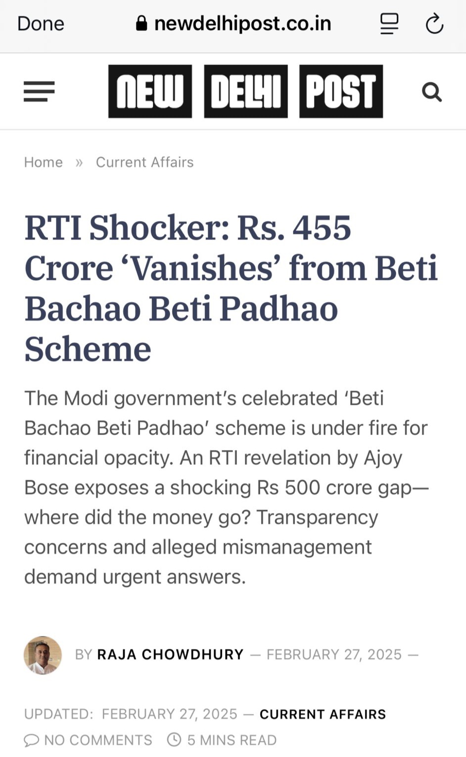 RTI Expose: ₹455 Crore Missing from Beti Bachao Beti Padhao! An RTI has revealed a shocking ₹455 crore gap in the Beti Bachao Beti Padhao scheme. While the government claimed to have spent ₹952.4 crore over 11 years, RTI data shows only ₹496.7 crore