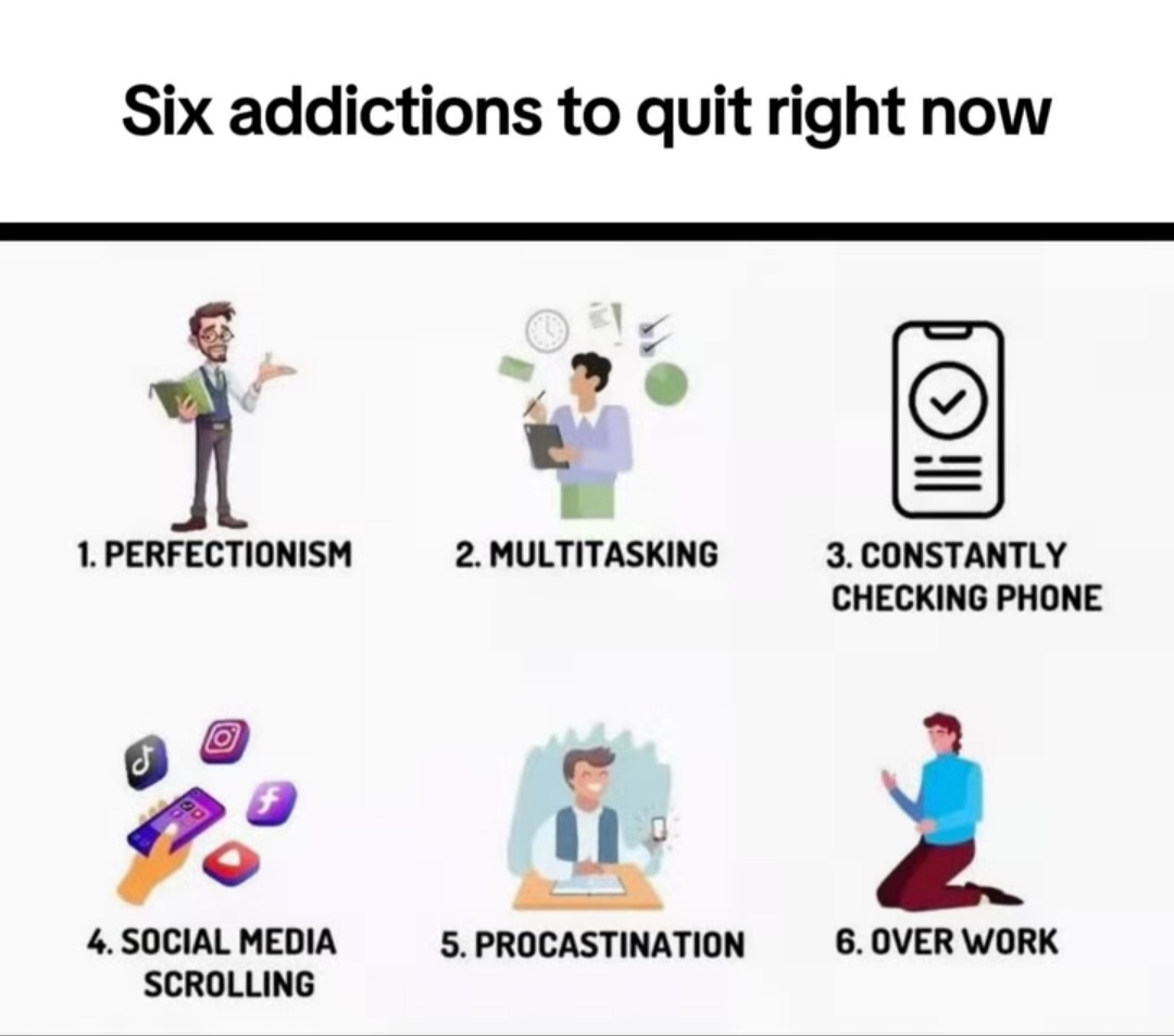 Six Addictions You Need to Quit Right Now & Why! ๐ซ 1๏ธโฃ Perfectionism โ Always chasing "perfect" slows you down. You never start, or you never finish. Progress beats perfection every time! 2๏ธโฃ Multitasking โ It feels productive, but it actually low