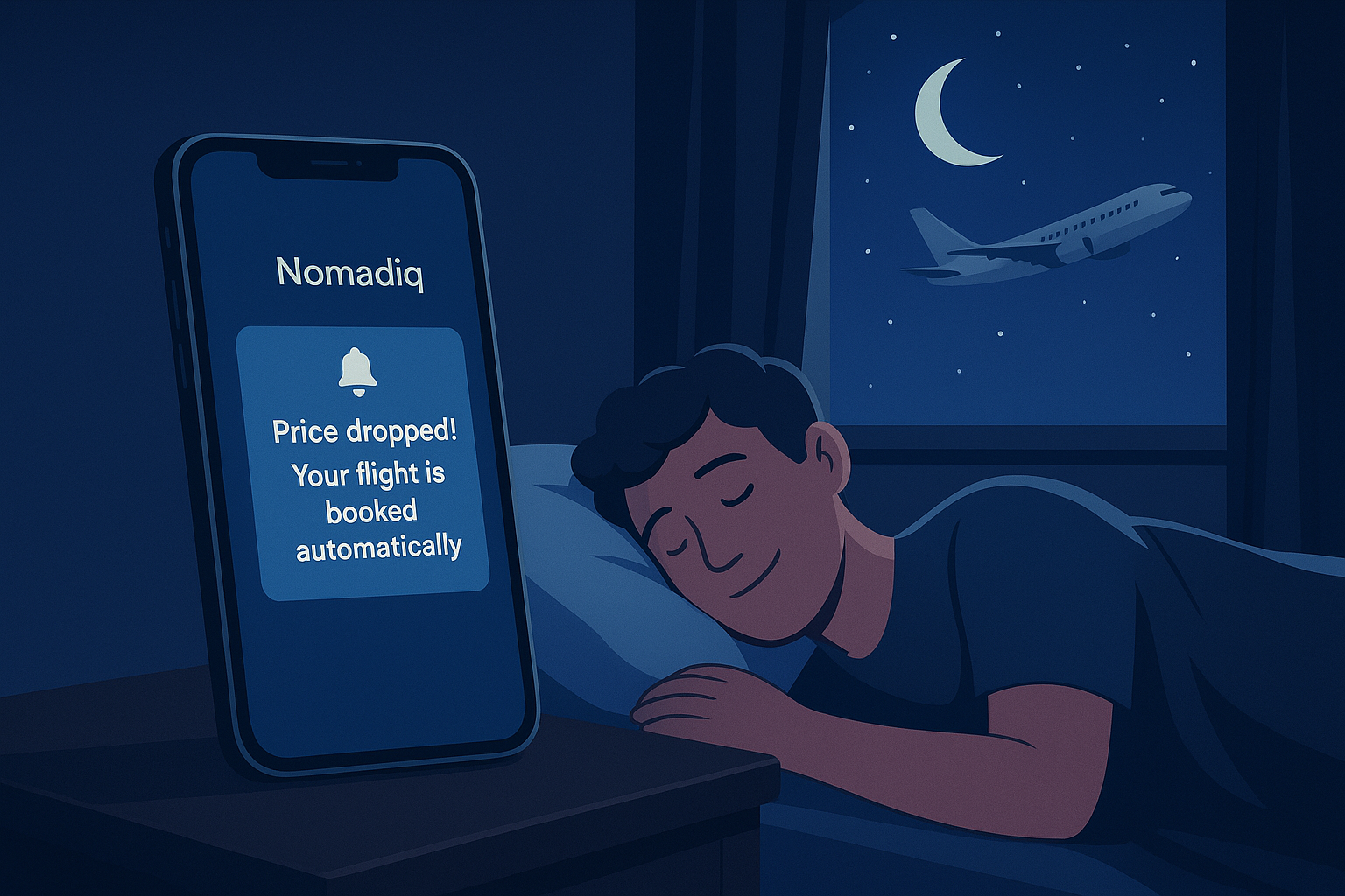 This is the exact problem we are solving. Most flight price drops happen when youโre either busy or sleeping โ and by the time you check, the deal is gone. With Nomadiq Smart Booking, we built a system that secures the deal on your behalf, automatic
