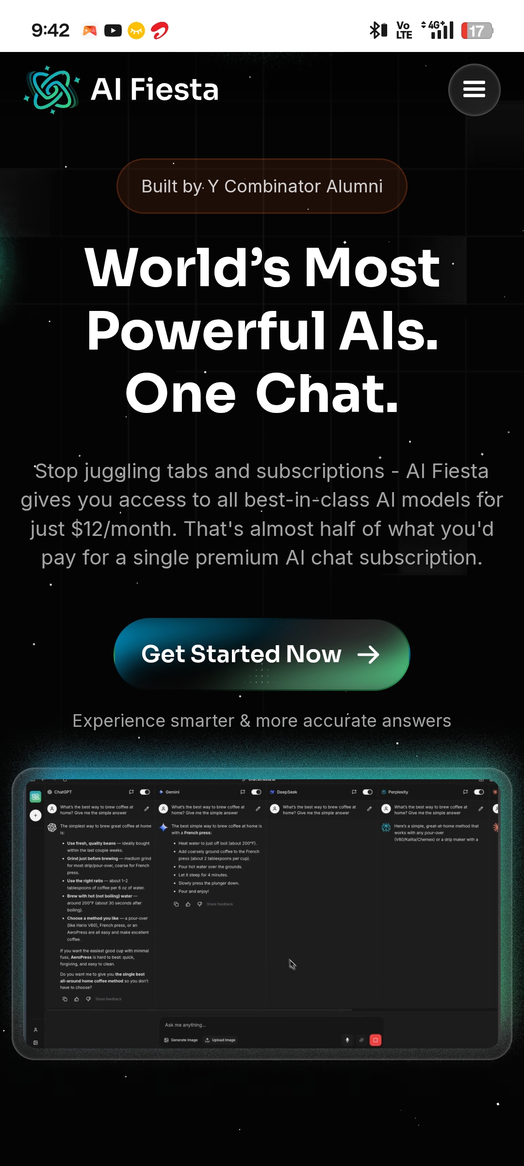 New AI Startup Alert: AI Fiesta by Dhruv rathee and Y Combinator Alumni has launched! An app that brings all premium chatbots—GPT-5, Gemini Pro, Claude, Perplexity & more—into one platform. 💡 One prompt → Multiple AI answers, side by side. ✨ Featu
