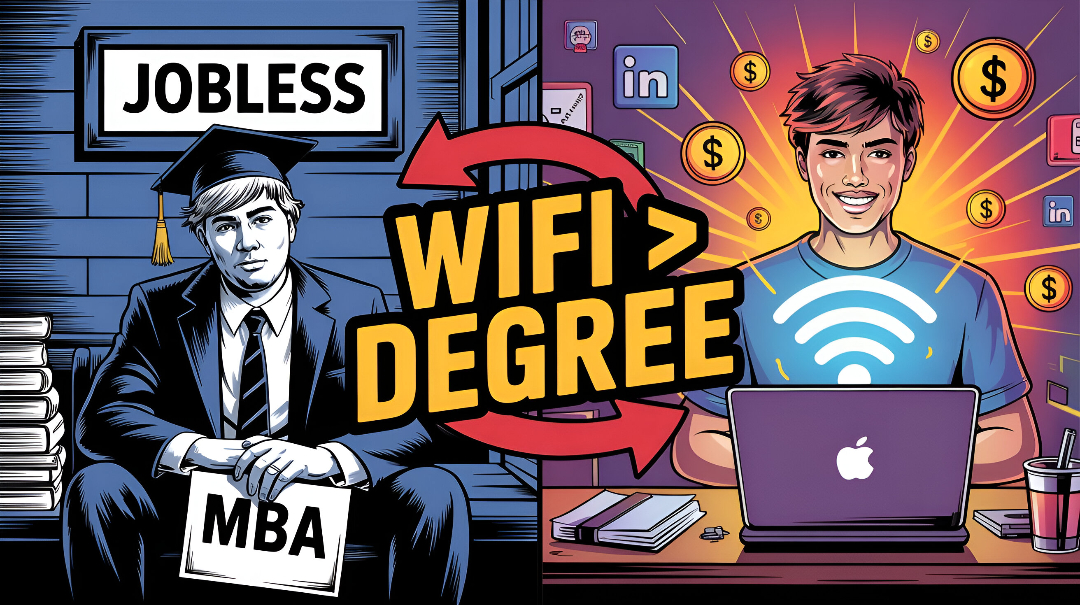 𝗬𝗼𝘂𝗿 ₹𝟱𝟬𝟬/𝗺𝗼𝗻𝘁𝗵 𝗪𝗶𝗙𝗶 𝗵𝗮𝘀 𝗺𝗼𝗿𝗲 𝗽𝗼𝘄𝗲𝗿 𝘁𝗵𝗮𝗻 𝗮 ₹𝟮𝟬 𝗟𝗮𝗸𝗵 𝗠𝗕𝗔. → One gives you debt. → The other gives you freedom. It’s not a joke. It’s the new Indian economy. 𝗪𝗵𝘆 𝗧𝗵𝗶𝘀 𝗜𝘀 𝗛𝗮𝗽𝗽𝗲𝗻𝗶𝗻𝗴 Old India = Learn for 20 years → Get job → Retire New India = Learn online → Build online → Earn globally Degrees are outdated for 3 reasons: 1. 𝐓𝐨𝐨 𝐬𝐥𝐨𝐰 – MBA takes 2 years, internet skills take 3 months. 2. 𝐓𝐨𝐨 𝐞𝐱𝐩𝐞𝐧𝐬𝐢𝐯𝐞 – MBA = ₹10–20L+, YouTube = Free 3. 𝐋𝐨𝐰 𝐑𝐎𝐈 – 28.7% of grads are jobless (CMIE, 2025) 𝐌𝐞𝐚𝐧𝐰𝐡𝐢𝐥𝐞: → Tier-2 kids are running agencies → Small-town creators have 1M+ followers → Freelancers earning in USD from laptops They don’t have elite degrees. They have digital leverage. 𝗗𝗮𝘁𝗮 𝗧𝗵𝗮𝘁 𝗣𝗿𝗼𝘃𝗲𝘀 𝗜𝘁 – 𝗙𝗿𝗼𝗺 𝗜𝗻𝗱𝘂𝘀 𝗩𝗮𝗹𝗹𝗲𝘆 𝗥𝗲𝗽𝗼𝗿𝘁 𝟮𝟬𝟮𝟱 → 𝐅𝐫𝐞𝐞𝐥𝐚𝐧𝐜𝐞 & 𝐜𝐫𝐞𝐚𝐭𝐨𝐫 𝐞𝐜𝐨𝐧𝐨𝐦𝐲 grew 𝟏𝟖𝟎% in Tier-2/3 cities → India’s 𝐝𝐢𝐠𝐢𝐭𝐚𝐥 𝐰𝐨𝐫𝐤𝐞𝐫𝐬 are building businesses, not just getting jobs → Platforms like 𝐔𝐩𝐰𝐨𝐫𝐤, 𝐅𝐢𝐯𝐞𝐫𝐫, 𝐘𝐨𝐮𝐓𝐮𝐛𝐞, 𝐈𝐧𝐬𝐭𝐚𝐠𝐫𝐚𝐦 are the new campuses → 𝐄𝐧𝐠𝐥𝐢𝐬𝐡 + 𝐈𝐧𝐭𝐞𝐫𝐧𝐞𝐭 = India's new caste advantage This is no longer theory. It’s visible. It’s trackable. And it’s 𝐬𝐜𝐚𝐥𝐢𝐧𝐠 𝐪𝐮𝐢𝐞𝐭𝐥𝐲. 𝗪𝗵𝗮𝘁 𝘁𝗼 𝗟𝗲𝗮𝗿𝗻 𝗜𝗻𝘀𝘁𝗲𝗮𝗱 𝗼𝗳 𝗮𝗻 𝗠𝗕𝗔? MBA teaches frameworks. The internet teaches 𝐞𝐱𝐞𝐜𝐮𝐭𝐢𝐨𝐧. Want to win? Learn: → 𝐂𝐨𝐩𝐲𝐰𝐫𝐢𝐭𝐢𝐧𝐠 → Sell through words → 𝐂𝐨𝐧𝐭𝐞𝐧𝐭 𝐂𝐫𝐞𝐚𝐭𝐢𝐨𝐧→ Build attention → 𝐏𝐞𝐫𝐬𝐨𝐧𝐚𝐥 𝐁𝐫𝐚𝐧𝐝𝐢𝐧𝐠→ Build inbound opportunities → 𝐅𝐫𝐞𝐞𝐥𝐚𝐧𝐜𝐢𝐧𝐠 & 𝐒𝐚𝐥𝐞𝐬 → Get global clients → 𝐂𝐨𝐦𝐦𝐮𝐧𝐢𝐭𝐲 𝐁𝐮𝐢𝐥𝐝𝐢𝐧𝐠 → Create distribution → 𝐀𝐈 𝐓𝐨𝐨𝐥𝐬 + 𝐀𝐮𝐭𝐨𝐦𝐚𝐭𝐢𝐨𝐧→ Work 10x faster → 𝐃𝐢𝐠𝐢𝐭𝐚𝐥 𝐌𝐚𝐫𝐤𝐞𝐭𝐢𝐧𝐠→ Help others grow, charge premium All of this is free or cheap to learn online. And you can earn while you learn. 𝗧𝗵𝗶𝘀 𝗜𝘀 𝘁𝗵𝗲 𝗡𝗲𝘄 𝗜𝗻𝗱𝗶𝗮 The new caste system = English + Internet Access The new IIT = Your YouTube The new MBA = Your monetized skill stack 𝗜𝗻 𝟮𝟬𝟮𝟱 𝗜𝗻𝗱𝗶𝗮: → WiFi = Your Degree → Skill = Your Resume → Internet = Your Campus Don’t beg for jobs. 𝐁𝐮𝐢𝐥𝐝 𝐟𝐨𝐫 𝐭𝐡𝐞 𝐠𝐥𝐨𝐛𝐚𝐥 𝐞𝐜𝐨𝐧𝐨𝐦𝐲. 𝐅𝐫𝐨𝐦 𝐲𝐨𝐮𝐫 𝐛𝐞𝐝𝐫𝐨𝐨𝐦. 𝗦𝗼𝘂𝗿𝗰𝗲𝘀 → [Indus Valley Report 2025 – Blume Ventures] → [CMIE – Youth Unemployment Rate 2025] → [Creator Economy India 2024 – Kalaari Capital] → [Upwork/Fiverr Data – India Freelancers] → [LinkedIn India Workforce Report 2025]