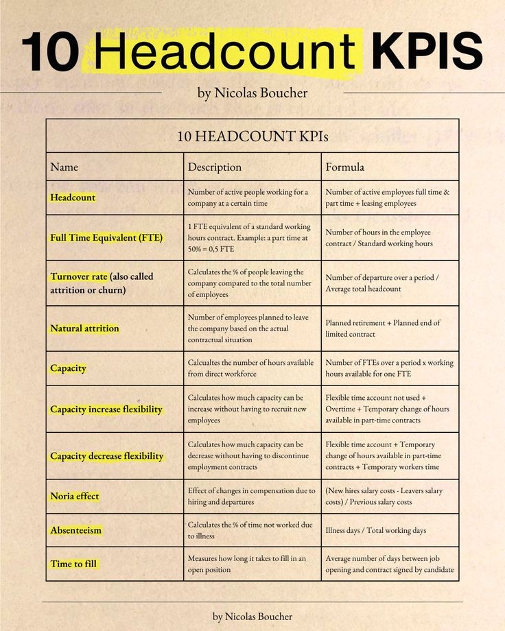 Founder, HR and Ops lead - 10 critical KPIs that give you a real pulse on your team: 1) Headcount – How many people are actively working? 2) FTE (Full Time Equivalent) – Not all hours are equal. 3) Turnover Rate – How fast are people leaving? 4) Natural Attrition – Planned exits, not surprises. 5) Capacity – Total hours available to get work done. 6) Capacity Increase Flexibility – Can you scale without new hires? 7) Capacity Decrease Flexibility – Can you scale down without layoffs? 8) Noria Effect – Cost impact of hiring vs. departures. 9) Absenteeism – Time lost due to illness. 10) Time to Fill – How long to hire? Track these KPIs = Make smarter team decisions. Save this. Share with your team. Or revisit before your next hire.
