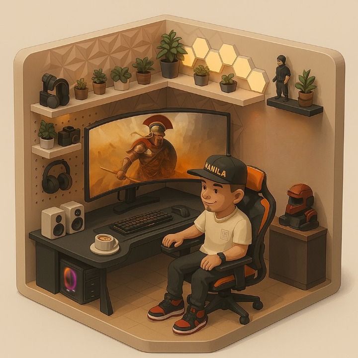 Open Chat GPT Paste this Prompt: Make an Isometric Diorama of my gaming setup(use the photo for reference) Put a cup of coffee on the table. Put hexagon rgb light on the wall and neon sign (Your Name) put mini plant and gadgets on the top shelves