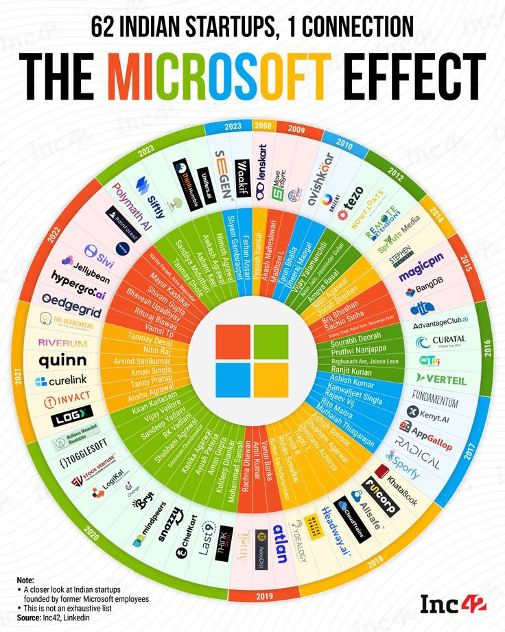 This is very Interesting, 62+ startups๐ in India have been founded by former Microsoft๐ป employees, with the majority focusing on deep tech sectors such as AI. Some of these you may know Segen.ai Lenskart Vockam Unbind.ai Polymath AI Sivi.ai Jellybean Hypergro.ai Edgegrid.ai Riverum Quinn Curelink Invact Logi.ai Togglesoft Logibricks Thirdeye.ai Smartrr Chatterbox Last9 Atlan The ePlane Company Headway.ai Khabook Incom Allscor Headrway.ai AppGallop Radicial Sportz Keny.ai Verteill Curatal OTP India AdvantageClub.ai BangDB Magicpin Share Media Tezo NoBroker Freadom Avishkaar 5ideas