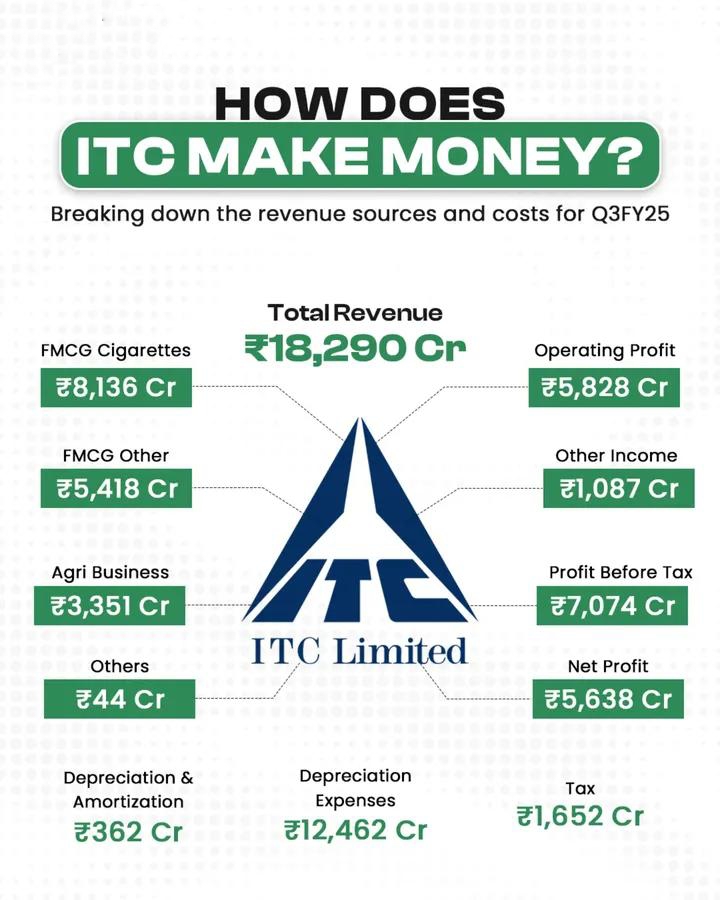 Revenue model of ITC 🙏 Almost 40% of revenue as well as profit comes from Cigarette sales, and it's the second largest FMCG company in india. Get more insight (Source)- https://www.startupsunion.com/blog/indian-startup-stories-5/business-model-of