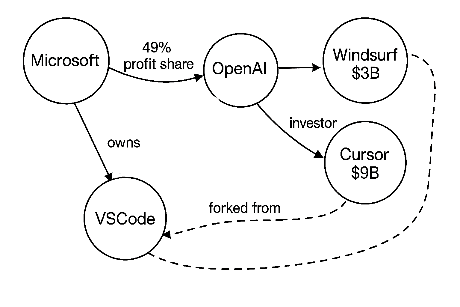 Microsoft owns VSCode and makes money from OpenAI. OpenAI invested in Windsurf and Cursor. Cursor, now worth more than Windsurf, started by copying/modifying Microsoft’s VSCode. So Microsoft indirectly helped create Cursor - but doesn’t control i