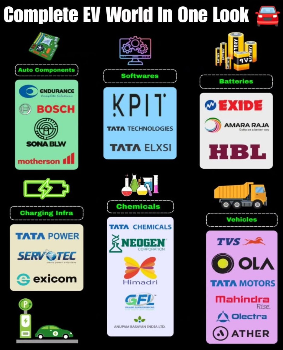 Complete EV World in One Look! 🚘 From Auto Components to Vehicles 🔋 From Batteries to Charging Infra 🧪 From Chemicals to Softwares ⚡The Future is Electric and it’s already here! 🔥 Big players like Tata, Bosch, Ola, Mahindra, Exide, Ather, KPI