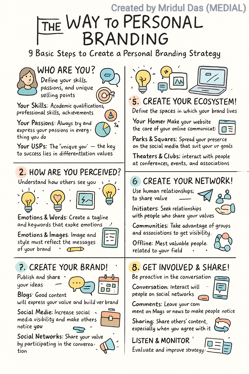๐ซThe 1st thing in entrepreneurship is Personal Branding, product comes next! Here is the Way to Personal Branding 9 Basic Steps to Create a Personal Branding Strategy 1. WHO ARE YOU? Define your skills, passions, and unique selling points. Your Skills: Academic qualifications, professional skills, achievements. Your Passions: Always try and express your passions in everything you do. Your USP's: The "unique you" โ the key to success lies in differentiation. 2. HOW ARE YOU PERCEIVED? Understand how others see you. Professional Relations: What do your colleagues, clients, and partners think? Online Reputation: Check what Google says about you 3. WHAT DO YOU WANT TO ACHIEVE? Define your vision, market, and style. Your Sector: Choose the area that suits your skills and business ideas. Your Market: Identify the target audience that you want to reach. Your Style: Plan your strategy based on clear and consistent values. 4. CREATE YOUR BRAND! Use emotions, images, and storytelling. Emotions & Words: Create a tagline and keywords that evoke emotions. Emotions & Images: Image and style must reflect the messages of your brand. Emotions & Storytelling: Tell a strong story about who you are and what you do. 5. CREATE YOUR ECOSYSTEM! Define the spaces in which your brand lives. Your Home: Make your website the core of your online communication. Parks & Squares: Spread your presence on the social media that suit your goals. Theaters & Clubs: Interact with people at conferences, events, and associations. 6. CREATE YOUR NETWORK! Use human relationships to share value. Initiators: Seek relationships with people who share your values. Communities: Take advantage of groups and associations to get visibility. Offline: Meet valuable people related to your field 7. CREATE ORIGINAL CONTENT! Publish and share your ideas. Blogs: Good content will express your value and build your brand. Social Media: Increase social media visibility and make others notice you. Social Networks: Share your value by participating in the conversation. 8. GET INVOLVED & SHARE! Be proactive in the conversation. Conversation: Interact with people on social networks. Comments: Leave your comment on blogs or news to make people notice you. Sharing: Share others' content, especially when you agree with it. 9. LISTEN & MONITOR! Evaluate and improve your strategy. News: Stay informed and know what others are saying about you. Criticism: Criticism helps you to grow โ donโt ignore it. Monitoring: Regularly analyze your online brand, audience, and Strategy