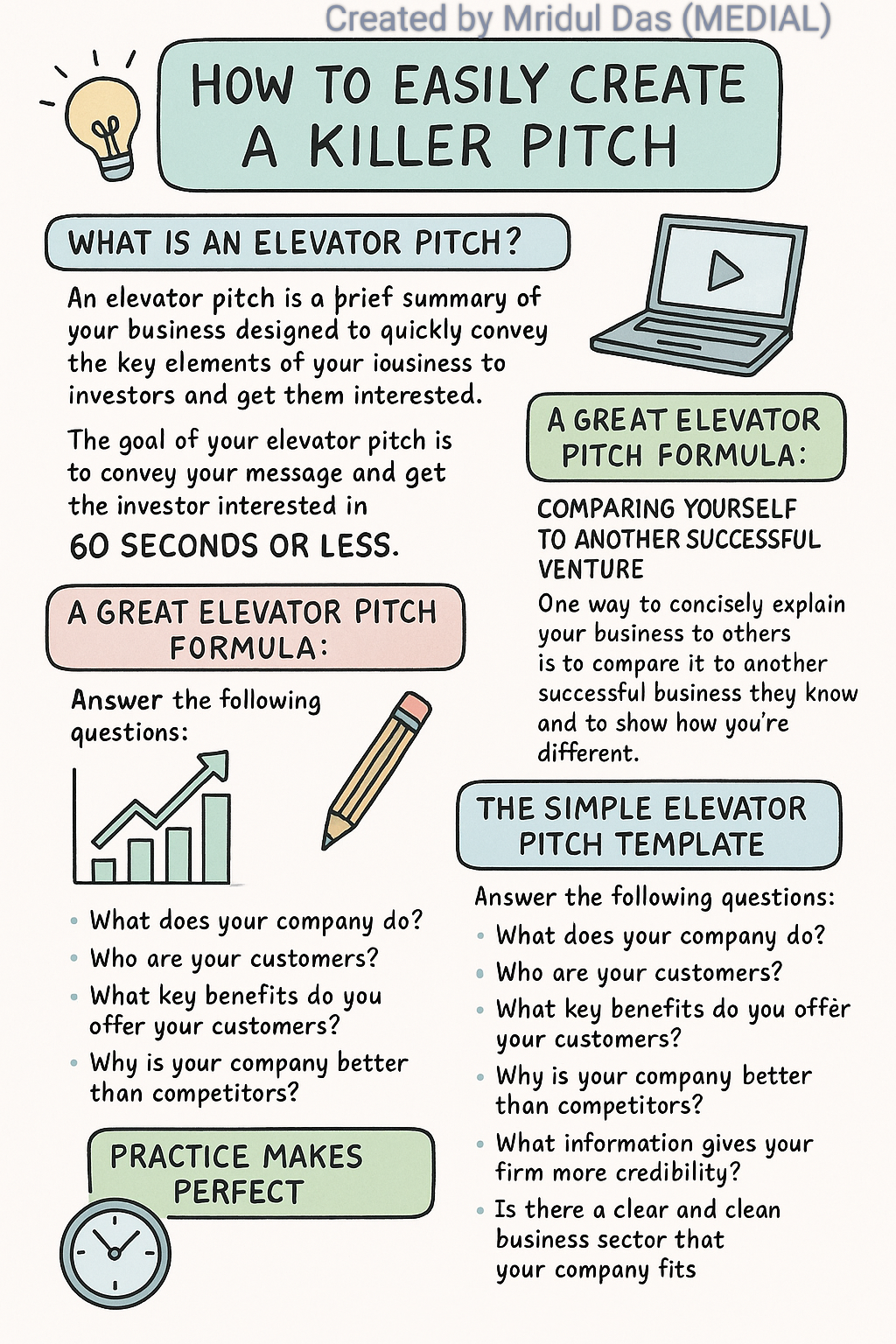 How to Easily Create a Killer Pitch (that gets investors HOOKED in 60 secs!) WHAT’S AN ELEVATOR PITCH? It’s a 60-sec power pitch that tells investors: What you do Why you matter And why they should CARE WHY IT MATTERS: Investors = busy. No clarity = no funding. They won’t wait—make it count, fast. THE FORMULA (it works!): “[Your biz] is like [famous brand], but for [your niche].” Boom—relatable + memorable! Your Pitch Should Answer: 1. What does your company do? 2. Who do you serve? 3. What value do you give? 4. Why are you better than the rest? 5. What gives you credibility? 6. What sector do you fit into? Pro Tip: Practice till it flows like your fav song. Confidence > Complexity. Now go impress someone in 60 secs or less!