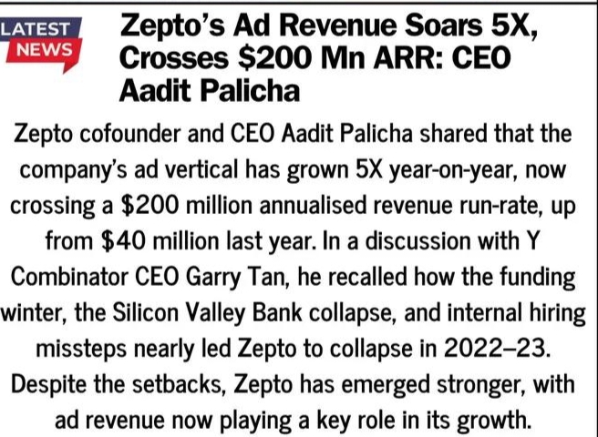 Zepto cofounder and CEO Aadit Palicha has revealed that the companyโs advertising vertical has grown its annualised revenue run-rate (ARR) by 5X over the past year, reaching the $200 million milestoneโup from $40 million last year. Speaking with Y Combinator CEO Garry Tan, Palicha highlighted how the ad business is now a major growth engine for the company.