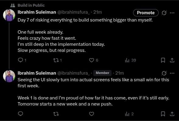 Day 7 of risking everything to build something bigger than myself. One full week already. Feels crazy how fast it went. I’m still deep in the implementation today. Slow progress, but real progress. Seeing the UI slowly turn into actual screens feel