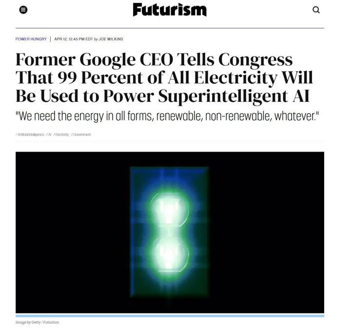 “99 Percent of All Electricity Will Be Used to Power Superintelligent AI” - Ex CEO of Google