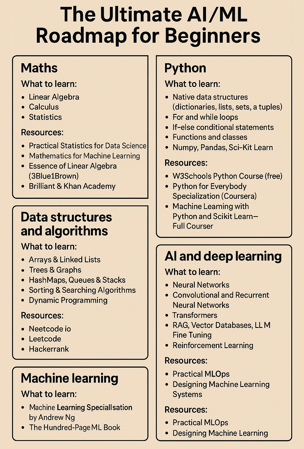 The ultimate AI/ML roadmap for beginners 👇 𝗠𝗮𝘁𝗵𝘀 What to learn: • Linear Algebra • Calculus • Statistics Resources: • Practical Statistics for Data Science( https://amzn.to/446czl5 ) • Mathematics for Machine Learning( https://amzn.to/441selL ) • Essence of Linear Algebra (3Blue1Brown) • Brilliant & Khan Academy 𝗣𝘆𝘁𝗵𝗼𝗻 What to learn: • Native data structures (dictionaries, lists, sets, and tuples) • For and while loops • If-else conditional statements • Functions and classes • Numpy, Pandas, Sci-Kit Learn Resources: • W3Schools Python Course (free) • Python for Everybody Specialization (Coursera) • Machine Learning with Python and Scikit-Learn - Full Course 𝗗𝗮𝘁𝗮 𝘀𝘁𝗿𝘂𝗰𝘁𝘂𝗿𝗲𝘀 𝗮𝗻𝗱 𝗮𝗹𝗴𝗼𝗿𝗶𝘁𝗵𝗺𝘀 What to learn: • Arrays & Linked Lists • Trees & Graphs • HashMaps, Queues & Stacks • Sorting & Searching Algorithms • Dynamic Programming Resources: • Neetcode.io • Leetcode • Hackerrank 𝗠𝗮𝗰𝗵𝗶𝗻𝗲 𝗹𝗲𝗮𝗿𝗻𝗶𝗻𝗴 What to learn: • Linear, logistic and polynomial regression • Decision trees, random forests and gradient-boosted trees • Support vector machines • K-means and K-nearest neighbour clustering • Feature engineering • Evaluation metrics • Regularisation, bias vs variance tradeoff and cross-validation Resources: • Machine Learning Specialisation by Andrew Ng • The Hundred-Page ML Book • Hands-On ML with Scikit-Learn, Keras, and TensorFlow ( https://amzn.to/4jCmP92) • The Elements of Statistical Learning ( https://amzn.to/44aTjTH ) 𝗔𝗜 𝗮𝗻𝗱 𝗱𝗲𝗲𝗽 𝗹𝗲𝗮𝗿𝗻𝗶𝗻𝗴 What to learn: • Neural Networks • Convolutional and Recurrent Neural Networks • Transformers • RAG, Vector Databases, LLM Fine Tuning • Reinforcement Learning Resources: • Deep Learning Specialization by Andrew Ng • Introduction to LLMs by Andrej Karpathy • Neural Networks: Zero to Hero • Reinforcement Learning Course - Lectures by David Silver 𝗠𝗟𝗢𝗽𝘀 What to learn: • Cloud technologies like AWS, GCP or Azure • Docker and Kubernetes • How to write production code • Git, CircleCI, Bash/Zsh Resources: • Practical MLOps (https://amzn.to/4iDPgCY ) • Designing Machine Learning Systems ( https://amzn.to/4iwZ2q5 )