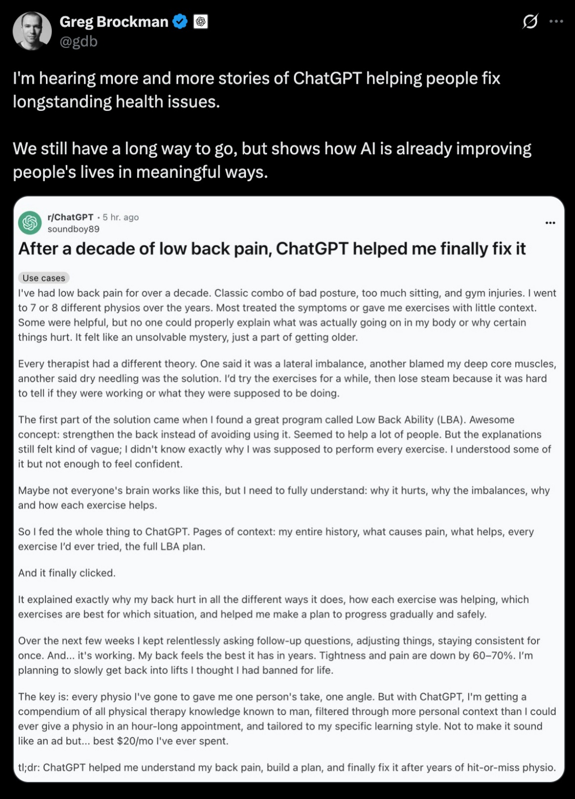 A reddit user says that Chatgpt helped him fix his chronic back pain issue. Even got shared by Greg Brockman, President of OpenAI. The user said it worked because it was the perfect blend of: Holistic view + Personal context + tailored to his learning style which the physios lacked. Its good that we are seeing truly meaningful use cases of AI. But, how many such problems have gone unsolved? Or even worse, got wrong advice from Ai? Would you trust AI with your health?