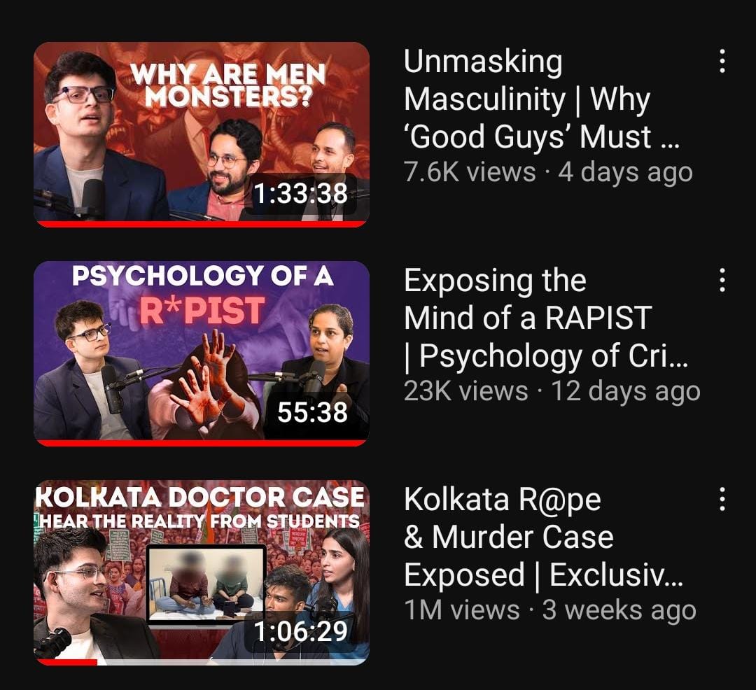 Dr Siddant Bhargava has a small YouTube channel where he discussed Kolkata's Rape and Murder case. I saw an interesting pattern .. radical degrowth in "views" when same topic cover over a period of time .. despite clickbait title like "men are mons